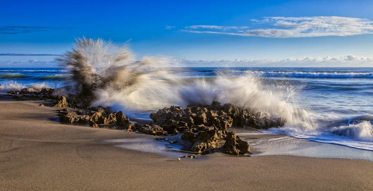 I decided to stay a little later than usual as I noticed the tide was rising and the water was approaching the sand and rocks in very interesting patterns. As these were being hammered by the water I realized that these splashes would make a very interesting image at just the right shutter speed: too long and it would make the water too silky and smooth; too short and it would capture just drops in the air. So i stayed and took several hundred shots. This one is my favorite. It shows the amazing power water has to create and shape a truly dynamic sense of movement and action.